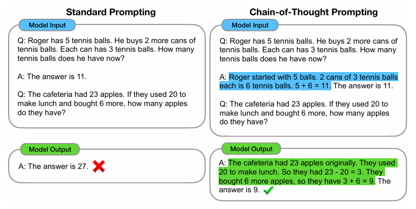 Die Idee geht auf eine Gruppe von Forscher:innen (Jason Wei et al.) zurück, die 2022 ein Paper namens „Chain-of-Thought Prompting Elicits Reasoning in Large Language Models“ veröffentlicht haben. Die ursprüngliche Erkenntnis war: Man zeigt einem Sprachmodell, wie es eine Aufgabe schrittweise erledigen soll, und schon verbessern sich die Ergebnisse und die Halluzinationsrate sinkt. Hier ein Beispiel aus dem Paper (Wei et al., 2022, 1)