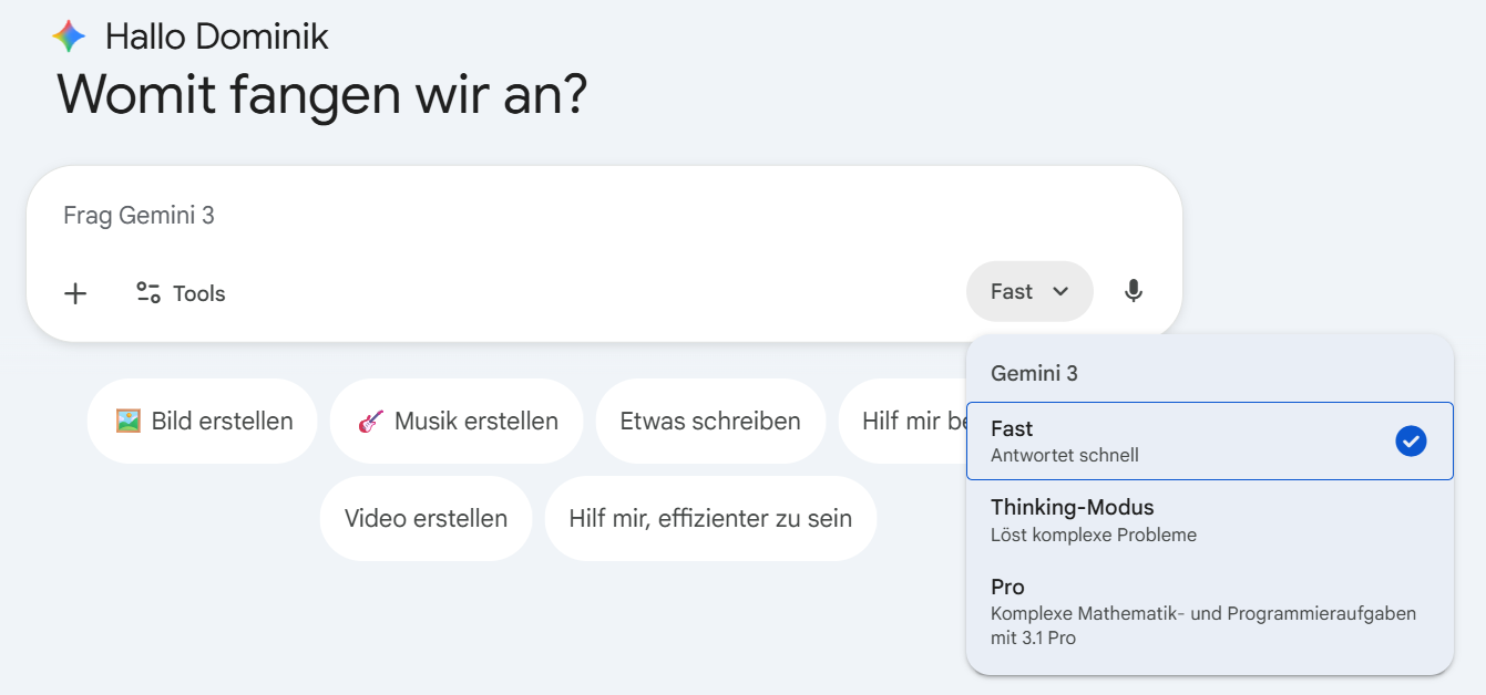 Gemini bietet Fast (schnell), Thinking-Modus (denkend) und Pro (intensiver denkend, greift auf das neuere Modell Gemini-3.1 zurück). Keinen automatischen Modus.