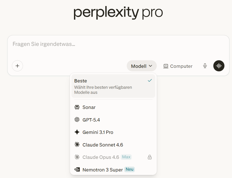 Manche KI-Tools bieten auch mehrere, unterschiedliche Sprachmodell-Familien zur Auswahl an. In Perplexity beispielsweise stehen mit Stand März 2026 sechs verschiedene Modelle von fünf verschiedenen Entwicklern zur Verfügung: