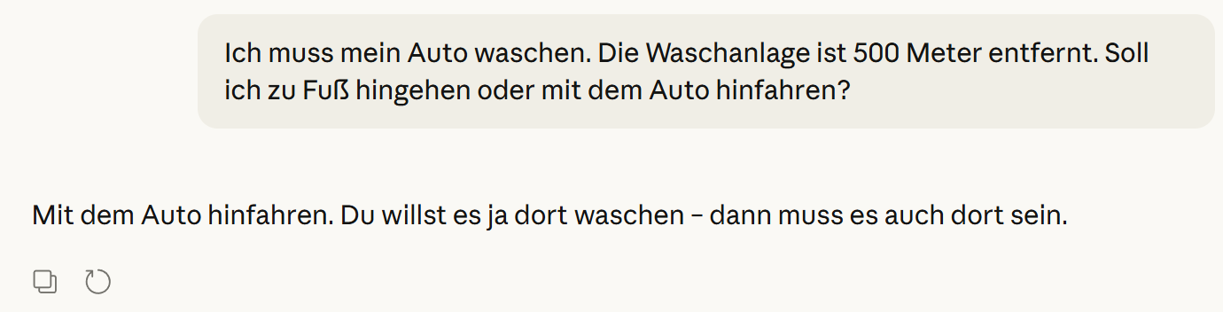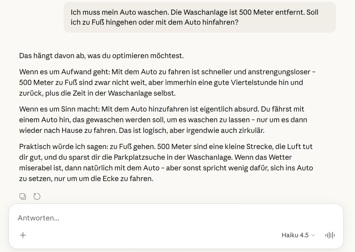 Sehen wir uns das auch mit einem Logik-Rätsel an, das die letzten Woche viral gegangen ist. Dabei wird ein Sprachmodell gefragt, ob man zu Fuß gehen oder mit dem Auto fahren soll, um das Auto in der 500 Meter entfernten Waschanlage zu waschen. Schnelle Modell versagen bei dieser Aufgabe meist miserabel. Claude-Haiku-4.5 empfiehlt hier beispielsweise, zu Fuß zu gehen: