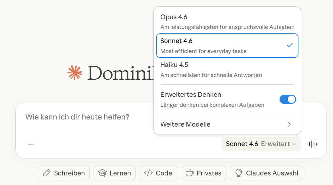 Claude bietet drei eigenständige Modelle: Haiku (schnell), Sonnet (vielseitig, kann nachdenken, empfohlen) und Opus (leistungsstark, denkt immer nach). Alle drei können mit „Erweitertem Nachdenken“ kombiniert werden.
