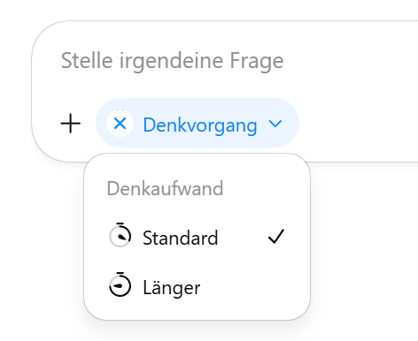 Thinking: Das denkende Modell. Startet einen sichtbaren Denkprozess. Dies kann wenige Sekunden, mehrere Minuten oder sogar eine halbe Stunde dauern. Man kann hier sogar zwischen dem “Standard”-Denkaufwand und einem längeren Denkaufwand auswählen: